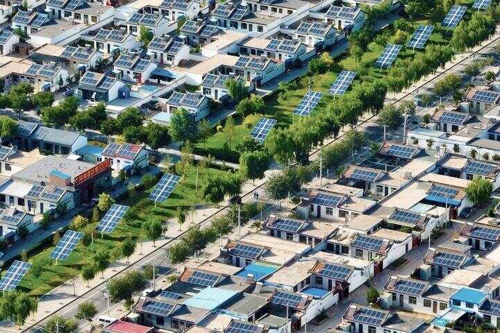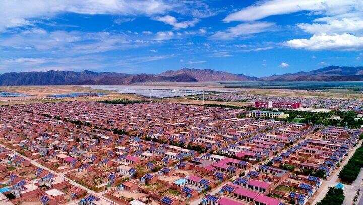 如今的闽宁镇,加速拥抱新质生产力,又有了新名片——“绿电小镇”,一块块蓝色光伏板整齐排列在空地、屋顶。(国网宁夏电力有限公司供图)