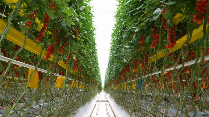 凯盛(银川)现代智慧农业科技有限公司,在闽宁镇打造的智慧农业产业园玻璃温室里,种植番茄。(永宁县委宣传部供图)