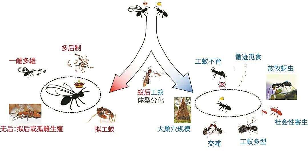 蚂蚁社会的复杂组织结构来源于多个表型性状与生活史特征之间的相互作用。研究发现,决定蚂蚁社会性的两个关键因素是巢穴的群体规模,以及蚁后与工蚁之间的分化程度。这两者为其他社会性状的演化(如工蚁的体型差异、生殖能力的丧失等)奠定了基础。