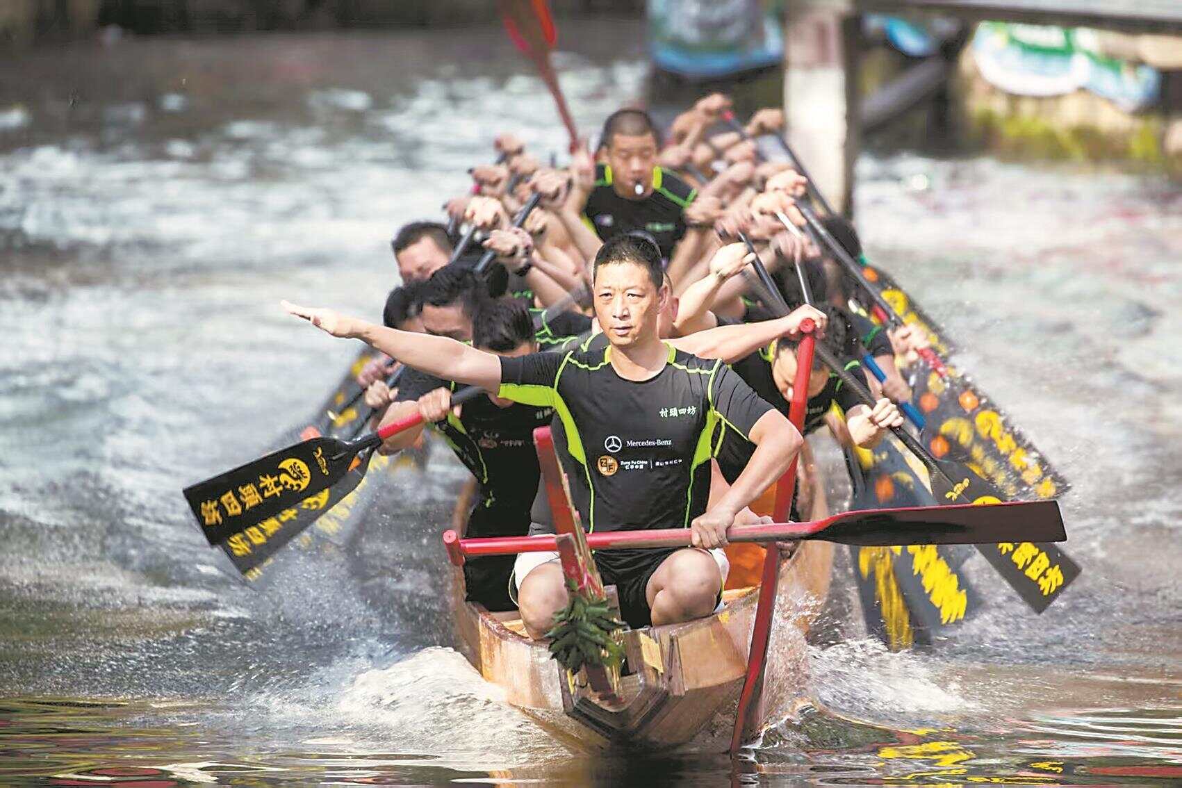 “咚、咚、咚……”今年端午节当天,佛山叠滘龙船漂移现场热闹非凡,人山人海。竞赛龙船上,佛山叠北社区村头四坊龙船队舵手庞朝汉镇定地坐在船头,带领其他5名舵手挥舞船桨,推动龙船在蜿蜒河道上飞驰竞速。