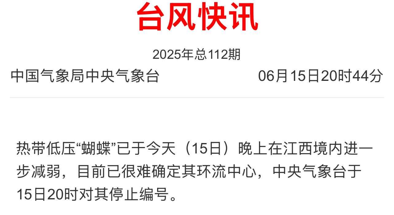 根据中央气象台观测,热带低压“蝴蝶”已于15日晚上在江西境内进一步减弱,目前已很难确定其环流中心,中央气象台于15日20时对其停止编号。