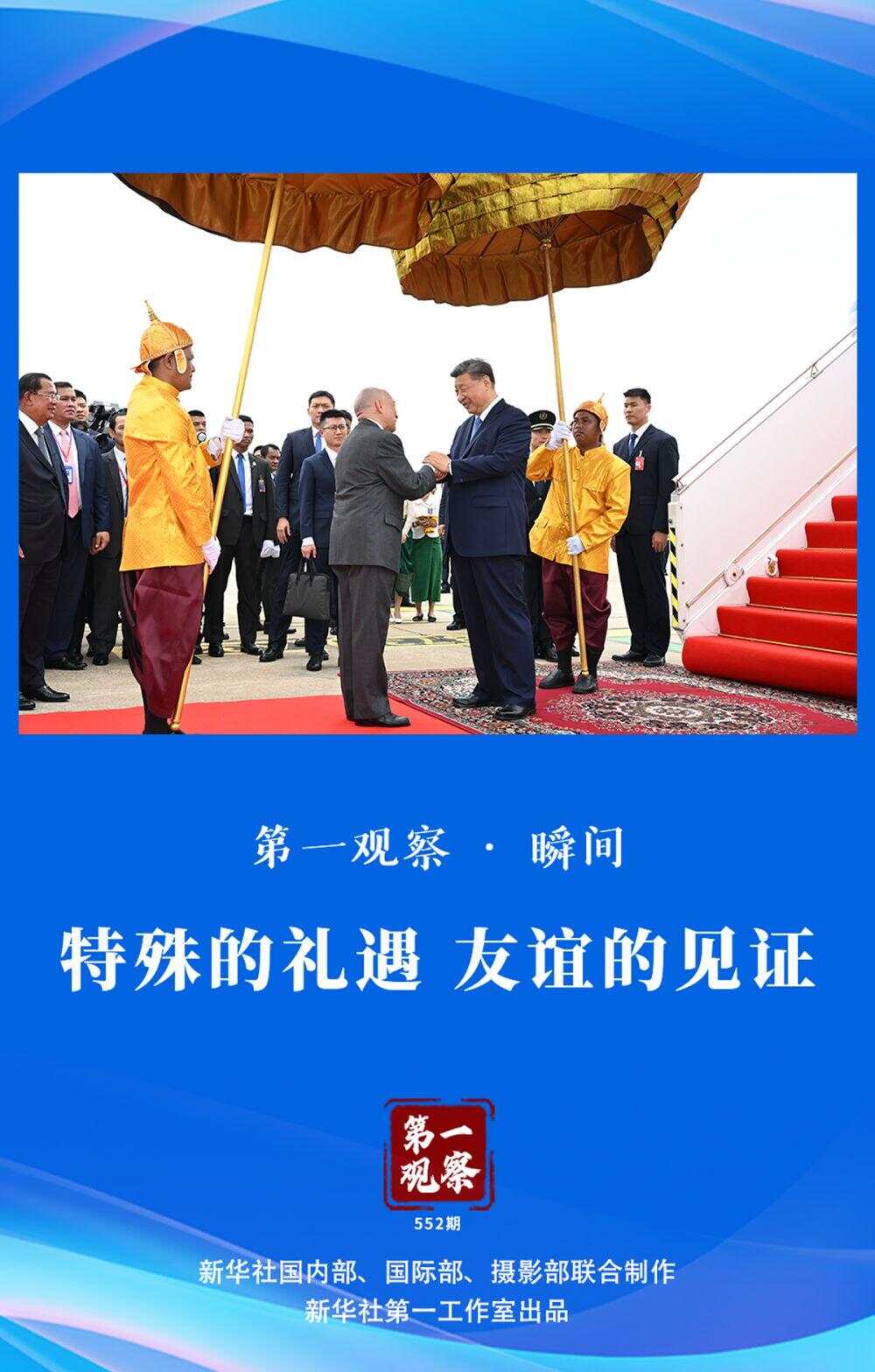 这是西哈莫尼国王首次在机场举行盛大仪式欢迎外国贵宾。柬埔寨王室珍娜公主向习近平主席献上茉莉花手环,数百名当地民众挥舞两国国旗,手持“柬中友谊、团结、合作万岁!”等红色横幅热情欢迎中国朋友……