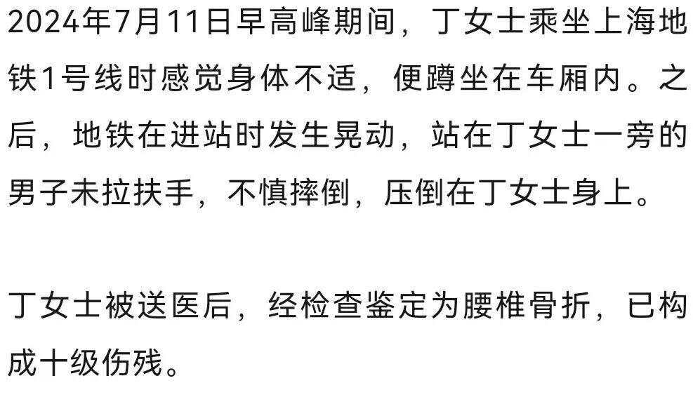 女子身体不适蹲坐地铁车厢,被摔倒的男乘客压骨折致十级伤残……法院判地铁赔偿15万元
